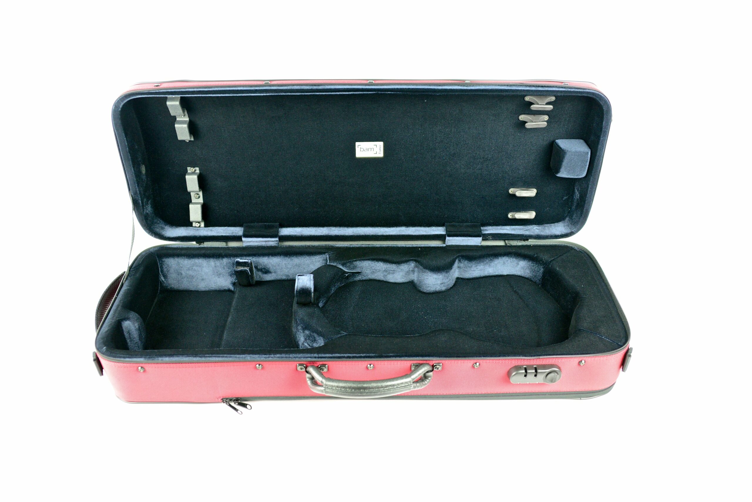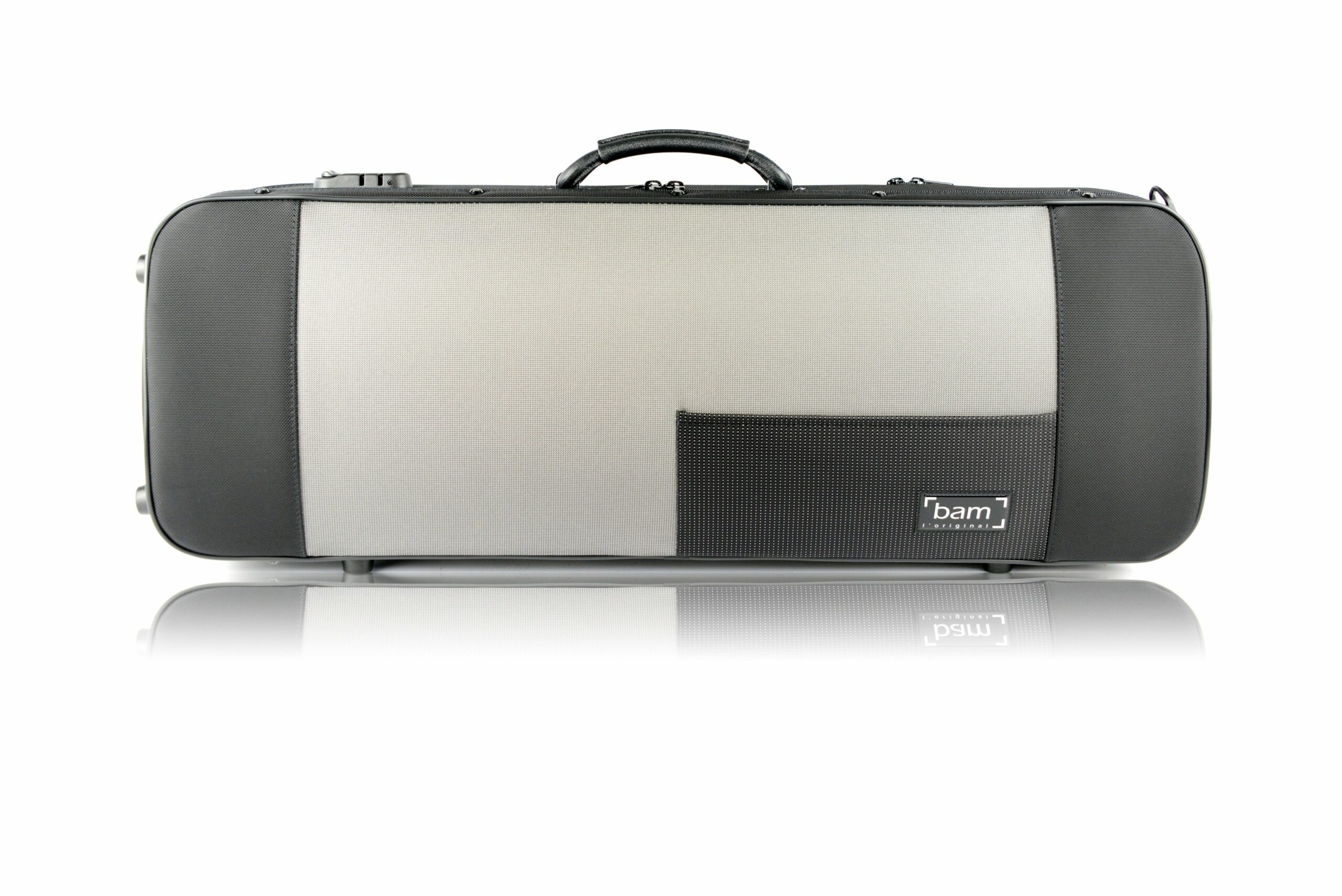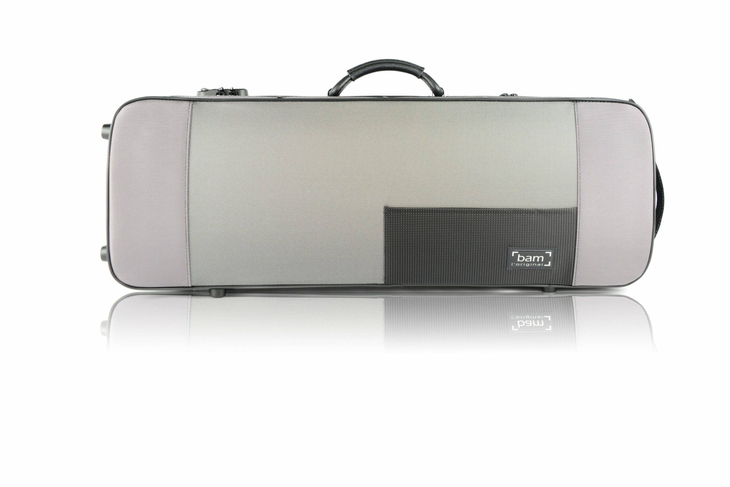 Estojo BAM Stylus Retangular para viola de arco 40cm: proteção térmica e antichoque com espuma PU. Cordura resistente à água, bolso p/ partituras, 4 arcos e zíper com senha.